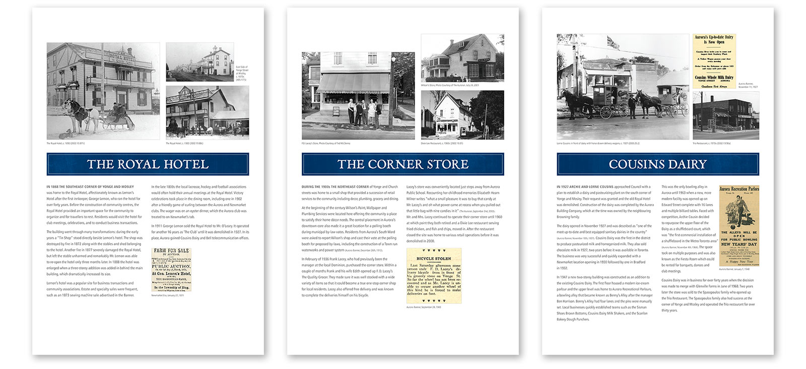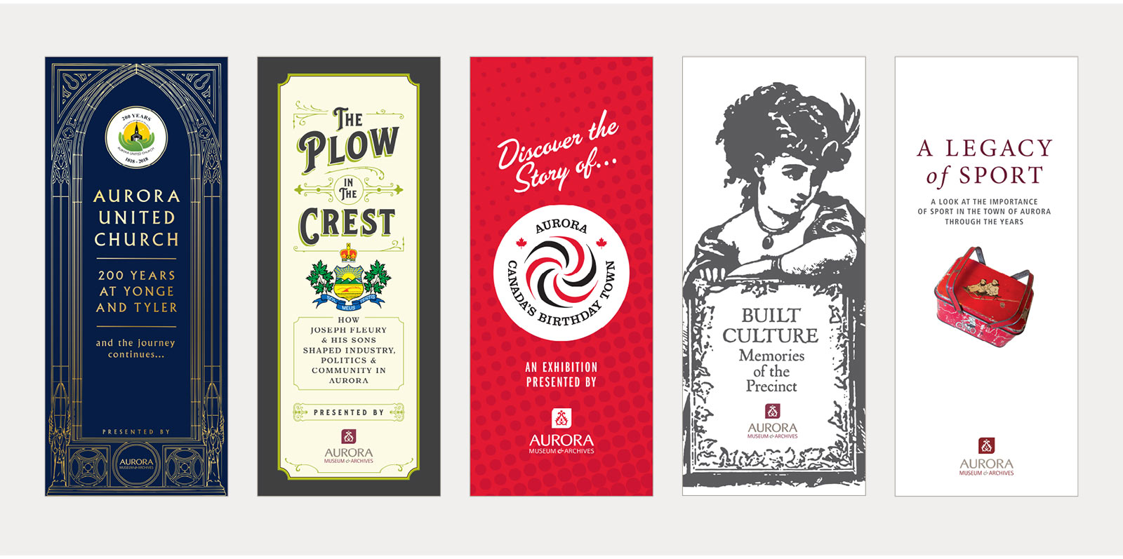 Working closely with the team at the Aurora Museum & Archives, we had the pleasure of designing multiple exhibits showcasing the Town of Aurora’s vibrant and rich history. We strive to give each of the exhibits its own unique voice and we love the process of turning all of the text and imagery provided into an engaging walkthrough experience using bold visuals, thoughtful graphic elements and carefully selected typography.